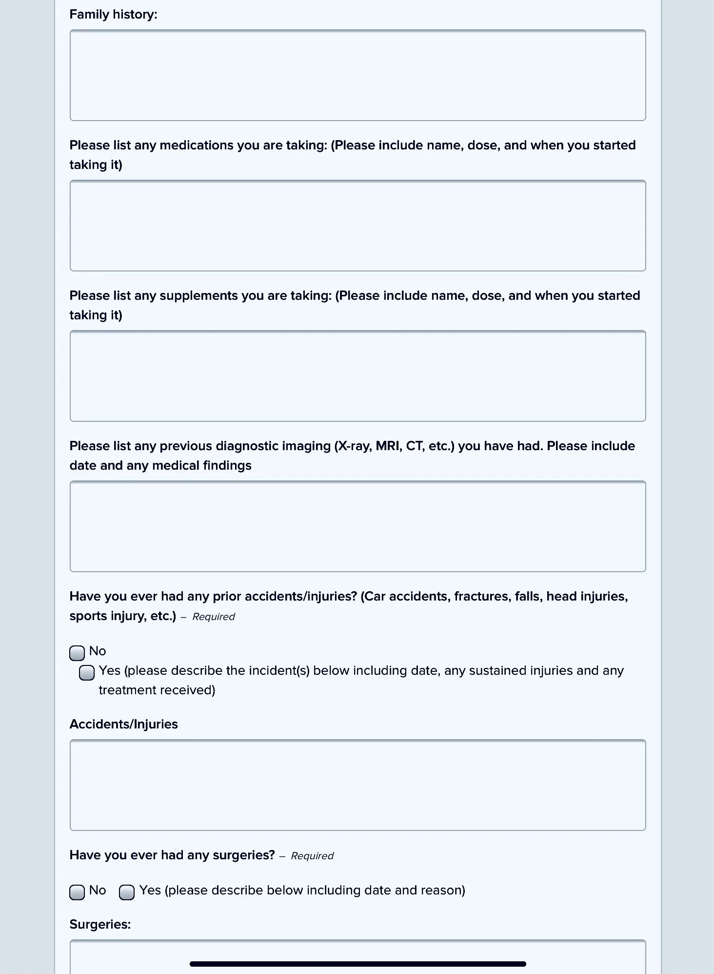 Prior to your first visit we’ll send you an intake form to complete at your leisure which helps us learn a little more about your health history, any medications you take etc.